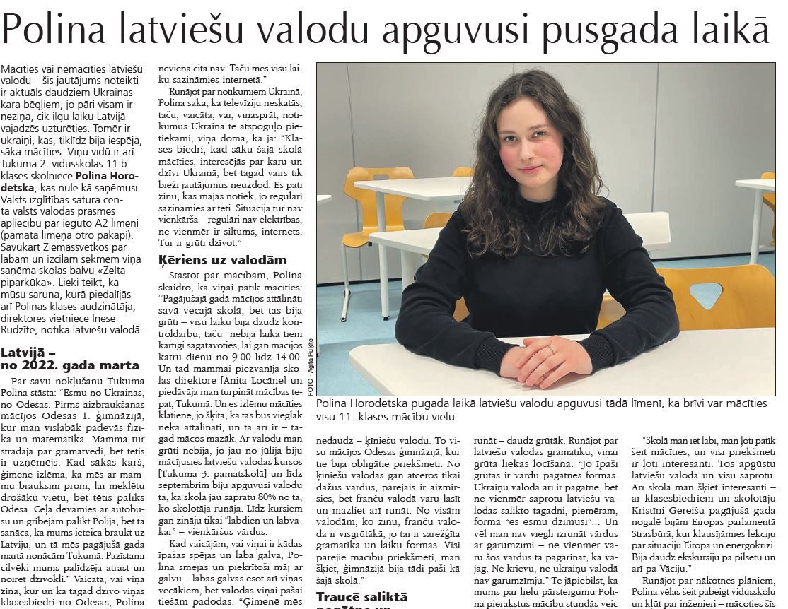 Mācīties vai nemācīties latviešu valodu – šis jautājums noteikti ir aktuāls daudziem Ukrainas kara bēgļiem, jo pāri visam ir neziņa, cik ilgu laiku Latvijā vajadzēs uzturēties. Tomēr ir ukraiņi, kas, tiklīdz bija iespēja, sāka mācīties. Viņu vidū ir arī Tukuma 2. vidusskolas 11.b klases skolniece Polina Horodetska, kas nule kā saņēmusi Valsts izglītības satura centa valsts valodas prasmes apliecību par iegūto A2 līmeni (pamata līmeņa otro pakāpi). Savukārt Ziemassvētkos par labām un izcilām sekmēm viņa saņēma skolas balvu «Zelta piparkūka». Lieki teikt, ka mūsu saruna, kurā piedalījās arī Polinas klases audzinātāja, direktores vietniece Inese Rudzīte, notika latviešu valodā.