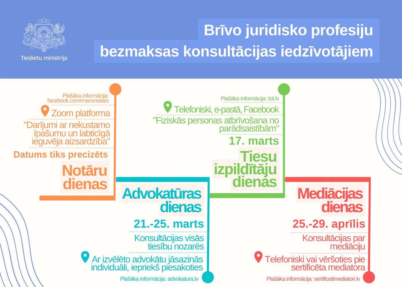 Ceturtdien, 17. martā, tiks uzsāktas “Brīvo juridisko profesiju dienas 2022”, kuru ietvaros iedzīvotājiem laika posmā no 17. marta līdz 29. aprīlim būs iespēja saņemt bezmaksas konsultācijas pie zvērinātiem tiesu izpildītājiem, zvērinātiem advokātiem, zvērinātiem notāriem un sertificētiem mediatoriem, risinot dažādus juridiska rakstura jautājumus.