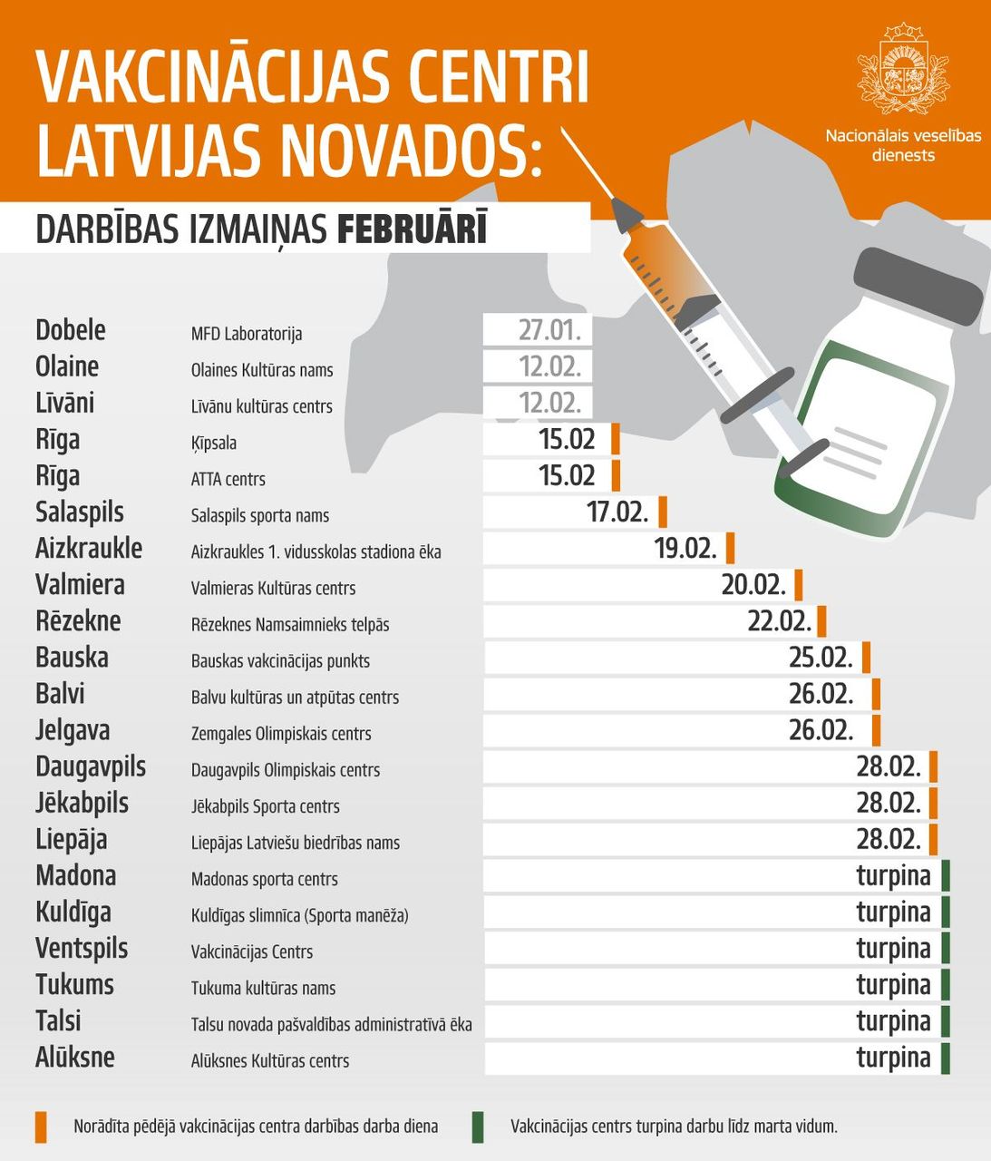 Mainoties pieprasījumam pēc Covid-19 vakcinācijas pakalpojuma saņemšanas, vakcinācijas procesā tiks ieviestas vairākas izmaiņas – turpināsies vakcinācija ģimenes ārstu praksēs, mājas un izbraukuma vakcinācija, savukārt vakcinācijas centri un vakcinācijas punkti lielveikalos gan novados, gan galvaspilsētā pakāpeniski noslēgs savu darbību. Lēmums par katra vakcinācijas punkta darbības izmaiņām ir balstīts uz vakcinācijas aktivitātes analīzi konkrētajā pašvaldībā un racionālu resursu plānošanu.