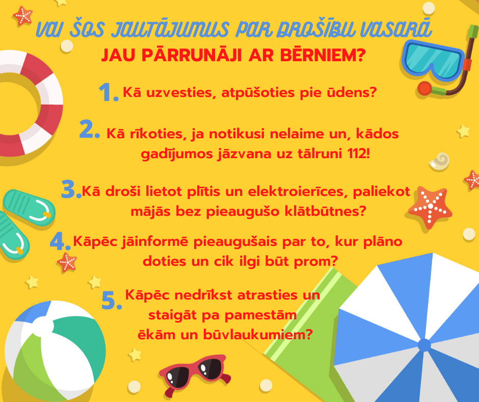 Lai vasara būtu piedzīvojumiem bagāta un tiktu aizvadīta bez liekām rūpēm un raizēm, Valsts ugunsdzēsības un glābšanas dienests (VUGD) aicina vecākus pārrunāt ar bērniem piecus jautājumus par drošību.