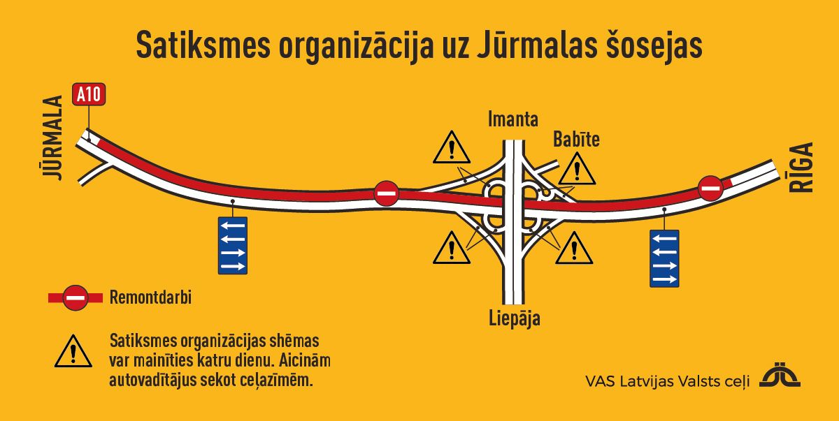 Šodienas laikā Jūrmalas šosejas (A10) remontdarbu zonā no Rīgas līdz Jūrmalai satiksme tiks pārslēgta uz vienu brauktuvi un tiks organizēta pa Rīgas virziena brauktuvi pa divām joslām katrā virzienā. Līdz ar to autobraucējiem ir jārēķinās ar papildu laiku ceļā, no rītiem un pēc darba dienas beigām satiksme tur var būt palēnināta.