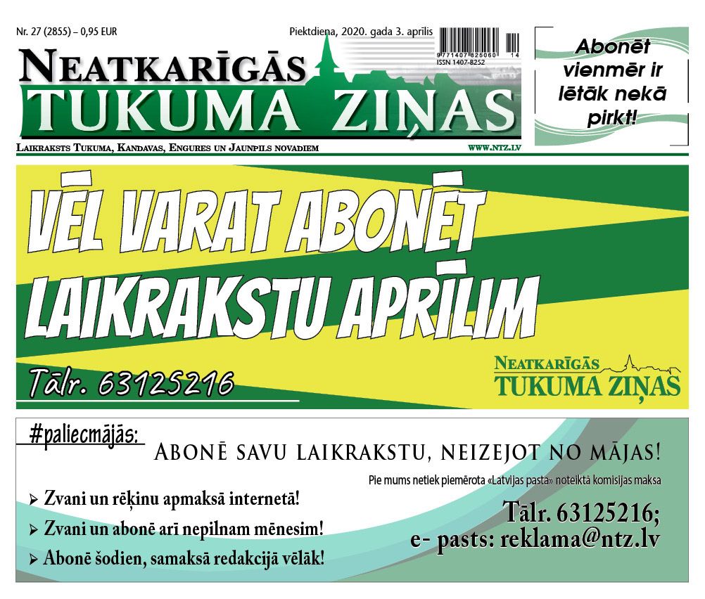 Kaut aprīlis jau burā, vēl arvien vari paspēt abonēt laikrakstu «Neatkarīgās Tukuma Ziņas». Bet, lai lieki nepārkāptu noteikumus par sociālo distancēšanos, to var pavisam ērti iespējams izdarīt ŠEIT=>https://www.ntz.lv/abonesana/neatkarigas-tukuma-zinas/