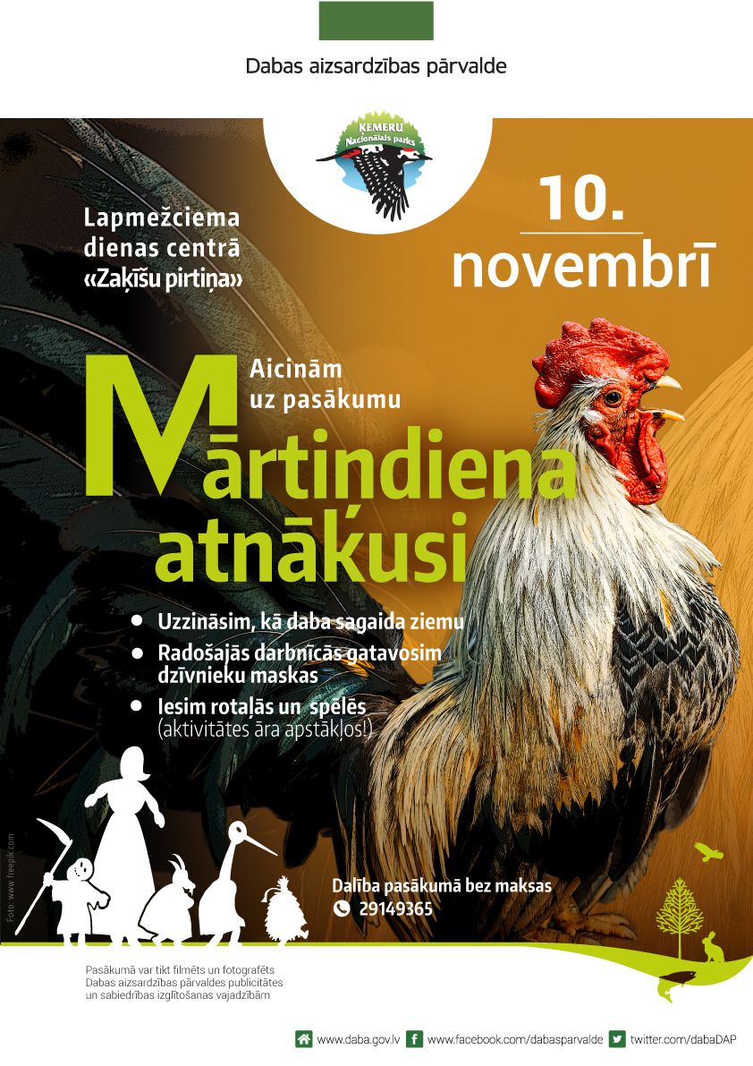 Svētdien, 10. novembrī no 12.00 līdz 15.00 Dabas aizsardzības pārvalde aicina uz pasākumu «Mārtiņdienas prieki». Tas notiks «Zaķīšu pirtiņā» Lapmežciemā, un tā laikā līdzās tradicionālajai masku gatavošanai, spēlēm, rotaļām un galvas lauzīšanai, ikviens interesents varēs izzināt Ķemeru Nacionālajā parkā mītošos dzīvniekus un izprast dabas procesus, tuvojoties ziemai.