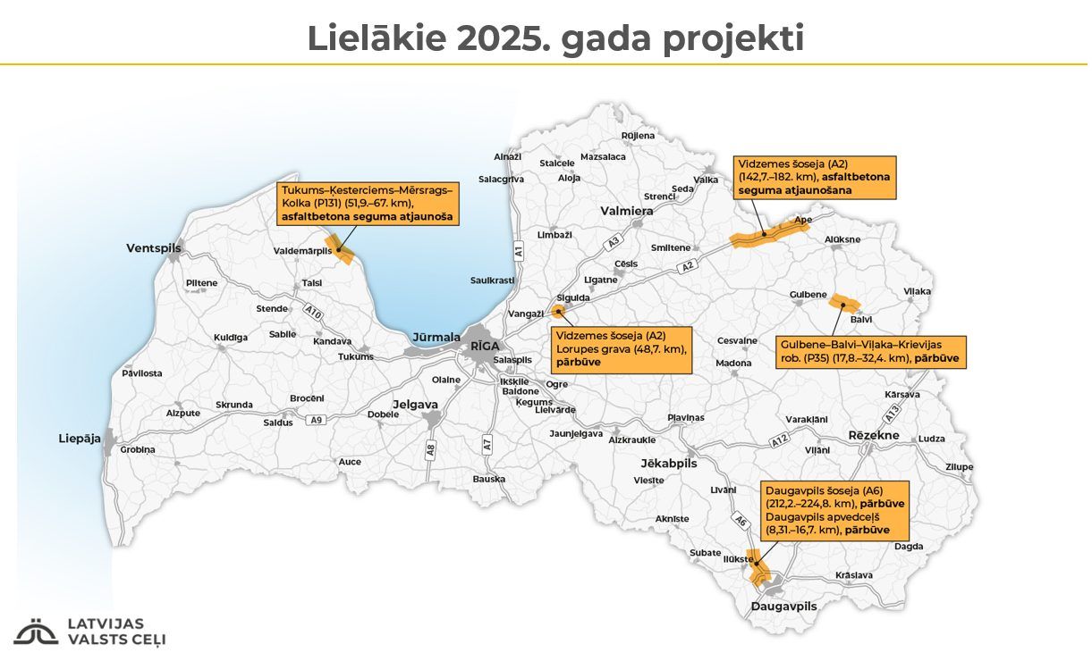 Šogad būvdarbi notiks vairāk nekā 600 km valsts autoceļu, lielākā daļa uz reģionālajiem un vietējās nozīmes autoceļiem. Uz valsts galvenajiem autoceļiem darbi notiks 119 km garumā, uz reģionālajiem – 259 km garumā, bet uz vietējiem – 230 km garumā. Karte ar visiem šogad plānotajiem būvdarbiem ir publicēta VSIA Latvijas Valsts ceļi (LVC) mājaslapā šeit: lvceli.lv/#kartes.