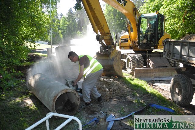 Tukumā, Durbē, pie estrādes, vīri atkal strādā. SIH «Meliorceltnieks» amatnieki estrādē un tās apkaimē būvē lietus ūdeņu novadīšanas ietaises.