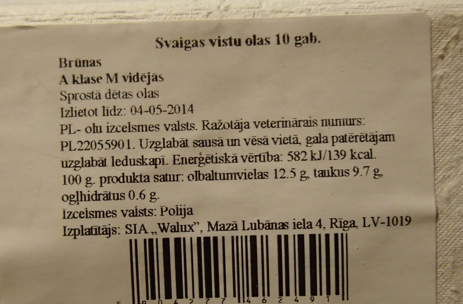 Pārtikas un veterinārais dienests (PVD) pirms Lieldienām veicot pārbaudes pārtikas aprites uzņēmumos, konstatējis, ka viena vairumtirdzniecības uzņēmuma noliktavā atrodas liels daudzums – vairāk kā 40 000 gab. Polijas izcelsmes vistu olu, kurām ražotāja noteiktais derīguma termiņš beidzies 2014.gada 14.aprīlī (14.04.2014.), taču olu iepakojumam ir veikts pārmarķējums, lai šādu, jau pārtikai nederīgu produkciju, izplatītu patērētājiem.