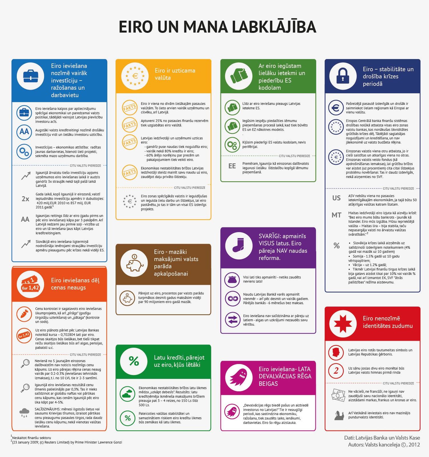 Eiropas vienotās valūtas ieviešana ir bijusi teju visu valdību prioritāte kopš Latvija iestājas Eiropas Savienībā 2004. gadā, taču tikai pēdējo trīs gadu laikā, pārvarot krīzi, valdība V. Dombrovska vadībā mērķtiecīgi rīkojusies šī mērķa īstenošanai. Kopš šī gada septembra Latvija izpilda visus Māstrihtas kritērijus, kvalificējoties iestājai eirozonā, un, ņemot vērā, ka sagatavošanās šai pārejai būs viens no svarīgajiem uzdevumiem 2013. gadā, valdības uzdevums ir detalizēti izskaidrot iedzīvotājiem visus ieguvumus un riskus, kas ar to saistīti. Tādēļ Valsts kanceleja sadarbībā ar Finanšu ministriju un Latvijas banku apkopojusi informāciju par īstermiņa un ilgtermiņa ieguvumiem un riskiem, kas saistīti ar eiro ieviešanu.