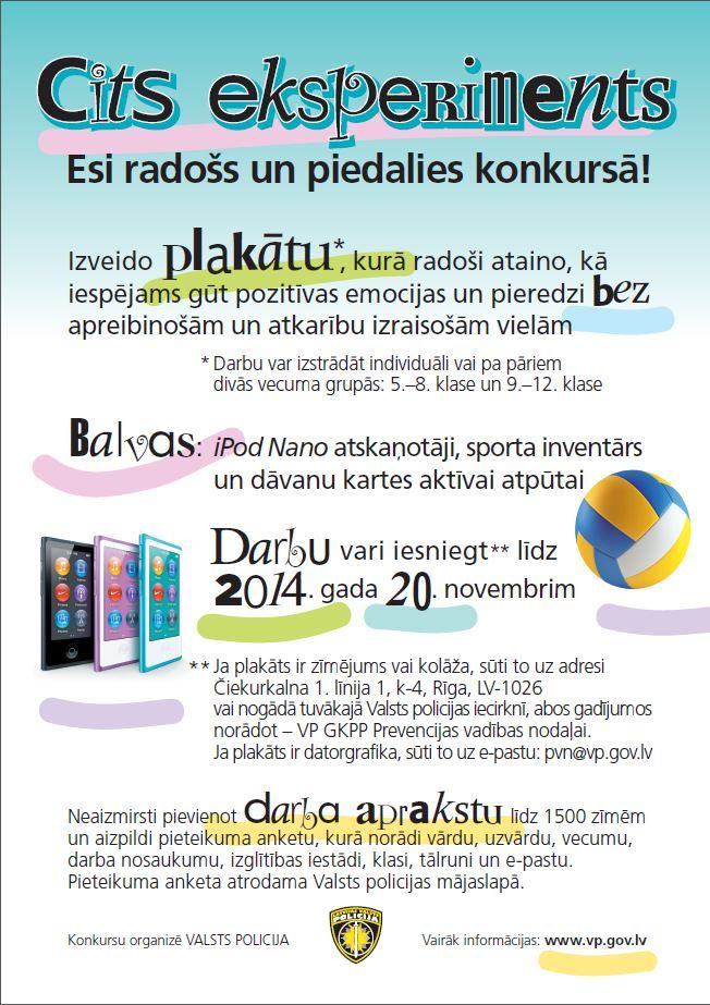 Lai veicinātu skolēnu iespēju darboties pozitīvā veidā bez apreibinošu, atkarību izraisošu vielu lietošanas, kā arī sekmētu radošās domāšanas attīstību, Valsts policijas Galvenās kārtības policijas pārvaldes Prevencijas vadības nodaļa visā Latvijā izsludina vizuālās mākslas konkursu «Cits eksperiments». Konkursā aicināti piedalīties skolēni no 5. līdz 12. klasei.