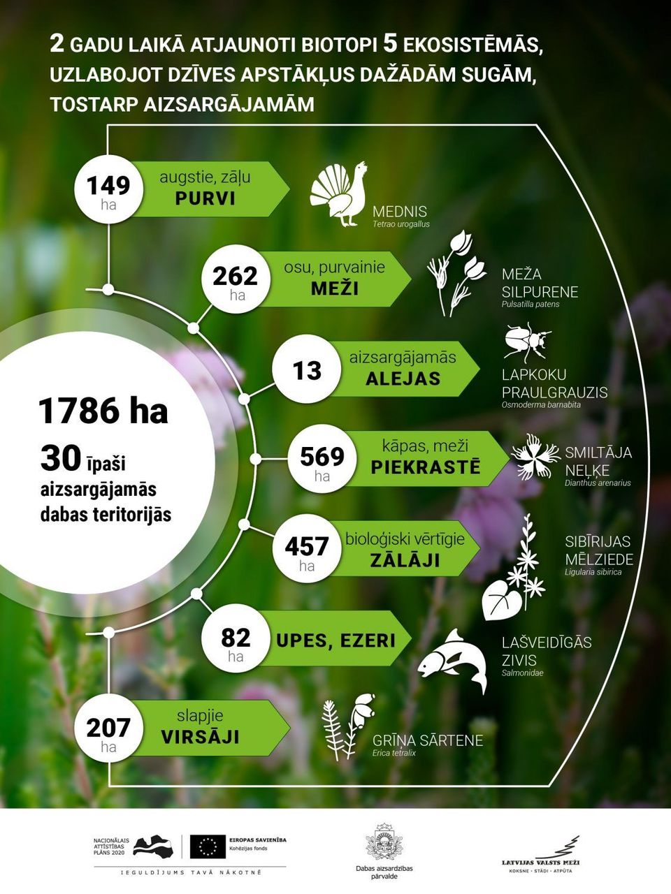 Dabas aizsardzības pārvalde ar partneriem 2021. gadā uzsāka projektu aizsargājamo biotopu un sugu dzīvotņu atjaunošanai. Pāris gados kopumā veikta Eiropas Savienības (ES) nozīmes biotopu un sugu dzīvotņu atjaunošana 1 786 hektāros 30 īpaši aizsargājamās dabas teritorijās jeb NATURA 2000, vienā mikroliegumā un 13 īpaši aizsargājamās alejās. Proti, atjaunotas lielas zālāju, virsāju un pelēko kāpu...