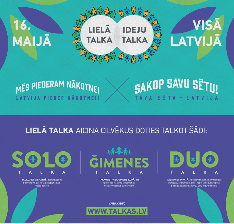 Ņemot vērā, pašreizējo situāciju Latvijā un visā pasaulē, kā arī paaugstinātas drošības un sociālās distancēšanās apstākļus, Lielā Talka šogad tiek organizēta, lielāku uzsvaru liekot uz individuālo talkošanu. Kā iepriekš tika ziņots, talka norisināsies 16.maijā, taču visus talkotājus aicinām izvēlēties vienu no sev piemērotākajiem un pašreizējos apstākļos pieļaujamajiem talkošanas formāliem.
