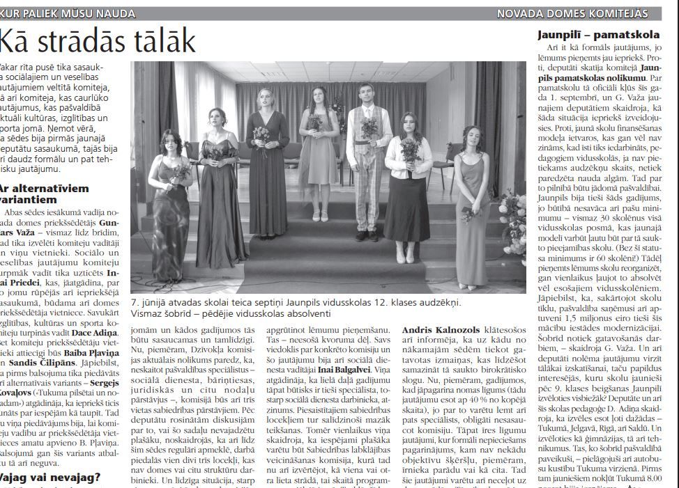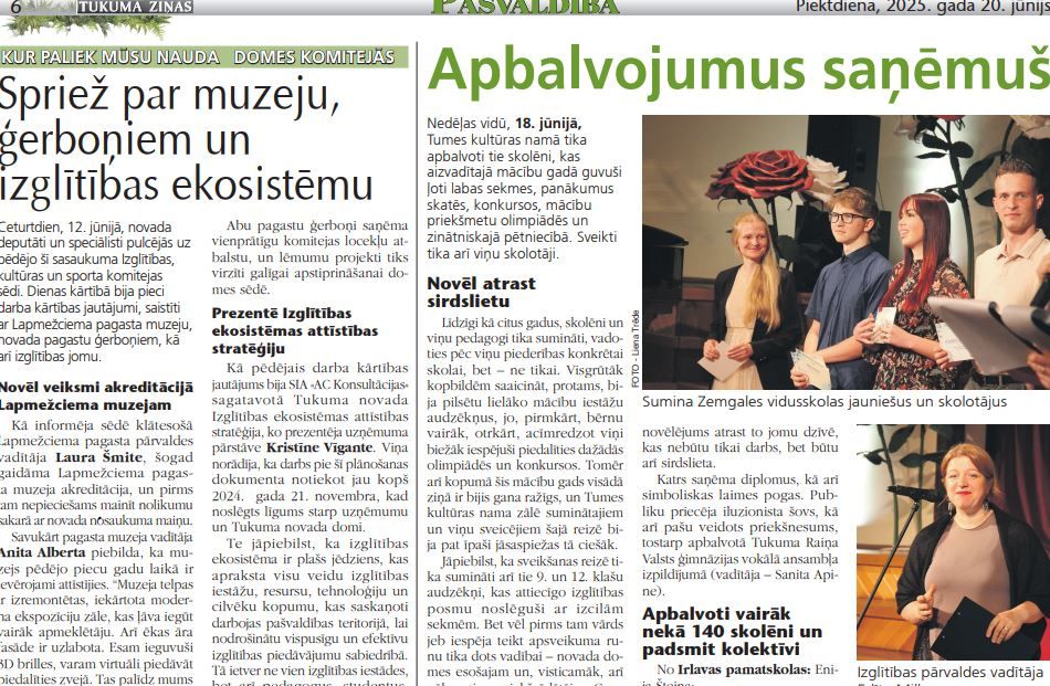 Ceturtdien, 12. jūnijā, novada deputāti un speciālisti pulcējās uz pēdējo šī sasaukuma Izglītības, kultūras un sporta komitejas sēdi. Dienas kārtībā bija pieci darba kārtības jautājumi, saistīti ar Lapmežciema pagasta muzeju, novada pagastu ģerboņiem, kā arī izglītības jomu.