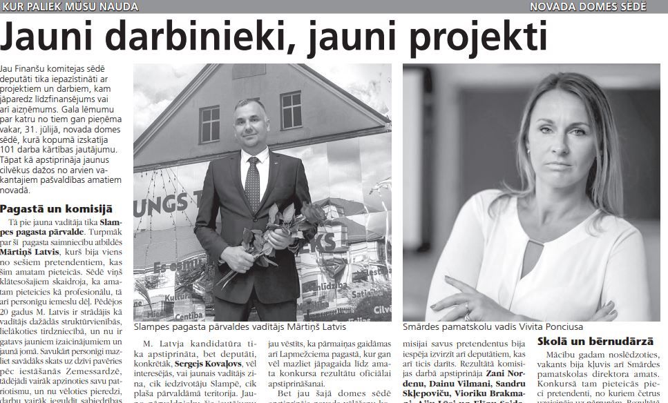 Jau finanšu komitejas sēdē deputāti tika iepazīstināti ar projektiem un darbiem, kam jāparedz līdzfinansējums vai arī aizņēmums. Gala lēmumu par katru no tiem gan pieņēma vakar, 31. jūlija, novada domes sēdē, kurā kopumā izskatīja 101 darba kārtības jautājumu. Tāpat kā apstiprināja jaunus cilvēkus dažos no arvien vakantajiem pašvaldības amatiem novadā.