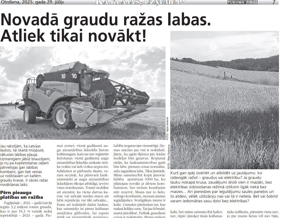 Jau rakstījām, ka Latvijas laukos, tai skaitā mūspusē, sākusies labības pļauja. Uzmanīgiem jābūt braucējiem, jo nu pa koplietošanas ceļiem pārvietojas gan labības kombaini, gan tiek vestas uz noliktavām un kaltēm graudu kravas. Ir sācies ražas novākšanas laiks.