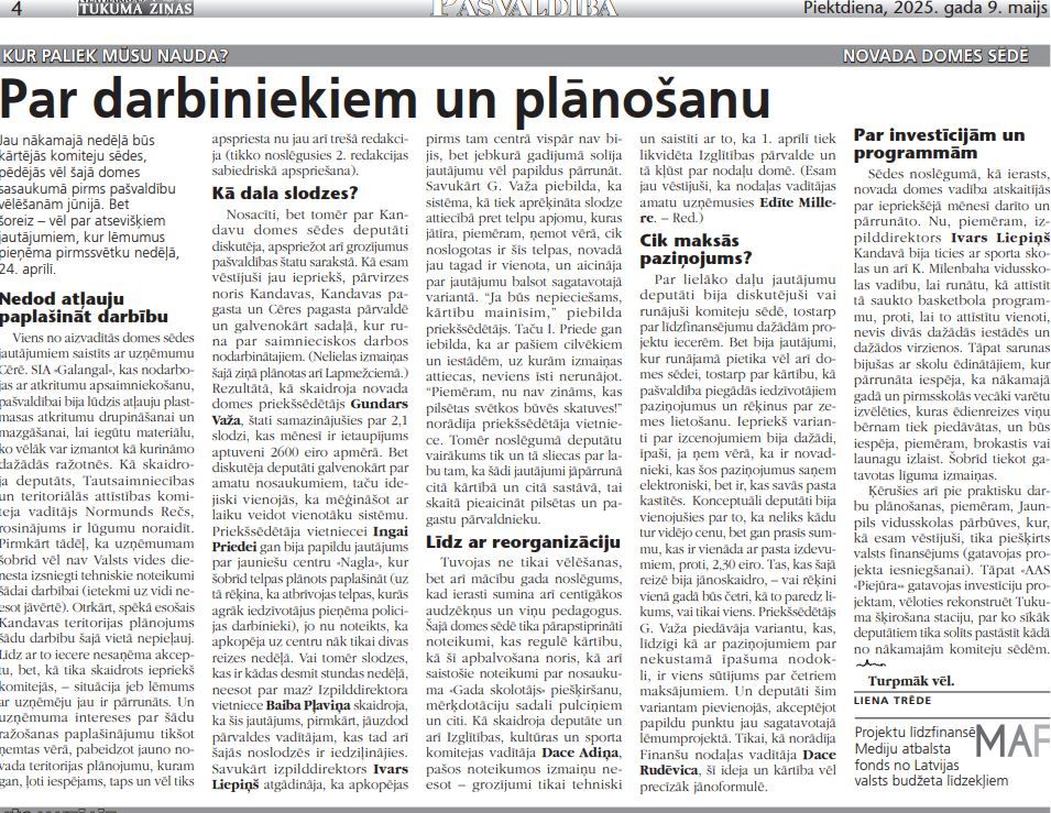 Īsi pirms svētkiem, 17. aprīlī, novada deputātiem bija gana intensīva darba diena – finanšu komitejas sēdē izskatīja vairāk nekā 60 jautājumus, kas tika virzīti tālāk uz domes sēdi 24. aprīlī. Komitejā lielākoties diskutēja gan ne gluži par naudu, kas, piemēram, piešķirama vienam vai otram projektam, vienam vai otram plānotajam darbam, bet vairāk par dažādām juridiskām niansēm.