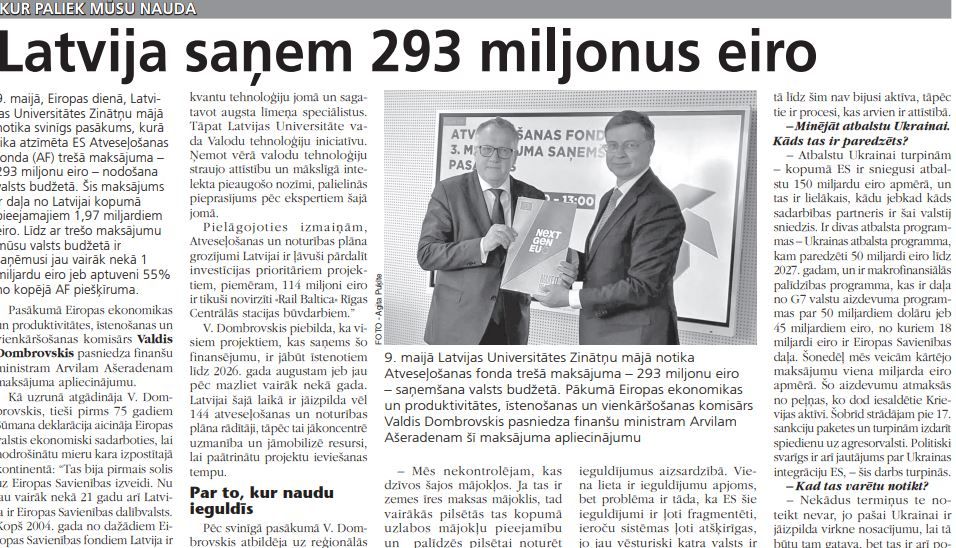 9. maijā, Eiropas dienā, Latvijas Universitātes Zinātņu mājā notika svinīgs pasākums, kurā tika atzīmēta ES Atveseļošanas fonda (AF) trešā maksājuma – 293 miljonu eiro – nodošana valsts budžetā. Šis maksājums ir daļa no Latvijai kopumā pieejamajiem 1,97 miljardiem eiro. Līdz ar trešo maksājumu mūsu valsts budžetā ir saņēmusi jau vairāk nekā 1 miljardu eiro jeb aptuveni 55% no kopējā AF piešķīruma.