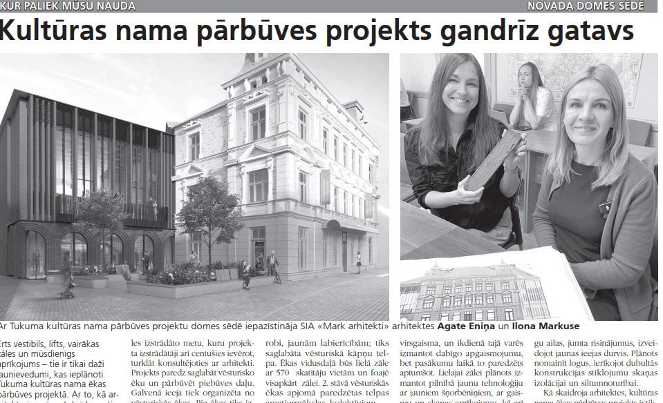 Ērts vestibils, lifts, vairākas zāles un mūsdienīgs aprīkojums – tie ir tikai daži jaunievedumi, kas ieplānoti Tukuma kultūras nama ēkas pārbūves projektā. Ar to, kā arhitektu iecerēs – šobrīd gan tikai datorprogrammā – pārtapis senais nams un tā piebūve, 28. maijā novada domes sēdē deputātus informēja SIA «Mark arhitekti» arhitektes Agate Eniņa un Ilona Markuse.