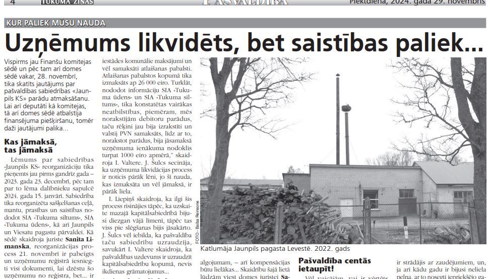 Vispirms jau Finanšu komitejas sēdē, un pēc tam arī domes sēdē vakar, 28. novembrī, tika skatīts jautājums par pašvaldības sabiedrības «Jaunpils KS» parādu atmaksāšanu. Lai arī deputāti kā komitejas, tā arī domes sēdē atbalstīja finansējuma piešķiršanu, tomēr daži jautājumi palika...
