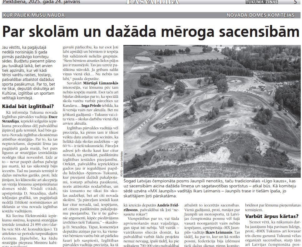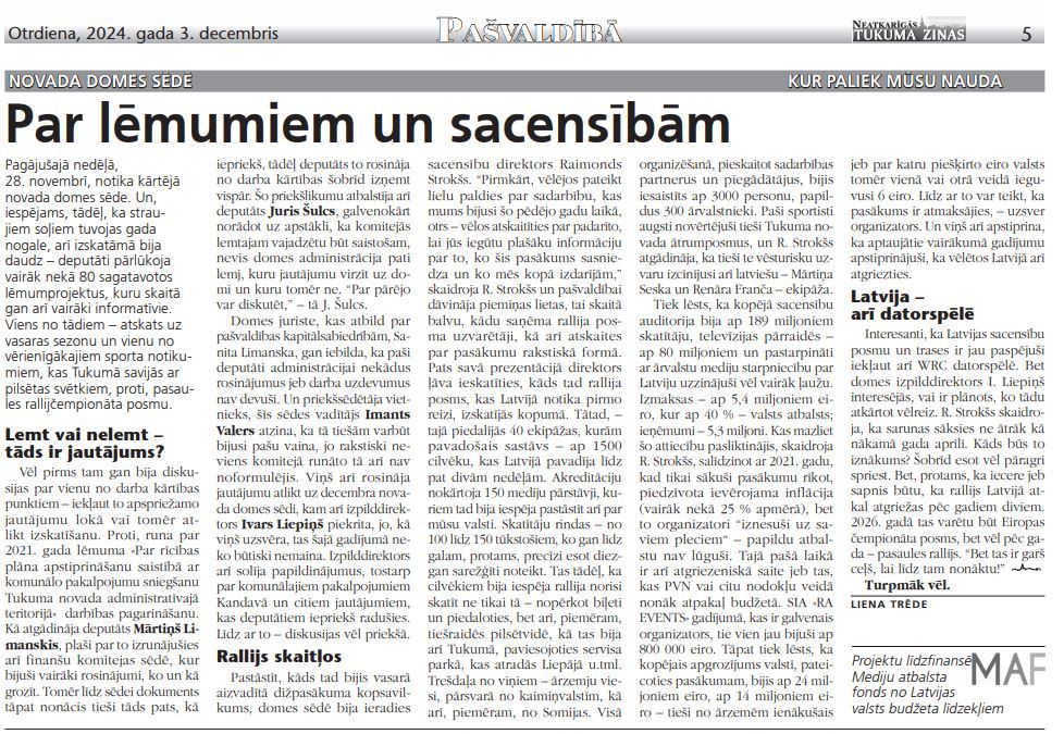 Pagājušajā nedēļā, 28. novembrī, notika kārtējā novada domes sēde. Un, iespējams tādēļ, ka straujiem soļiem tuvojas gada nogale, arī izskatāmā bija daudz – deputāti pārlūkoja vairāk nekā 80 sagatavotos lēmumprojektus, kuru skaitā gan arī vairāki informatīvie. Viens no tādiem – atskats uz vasaras sezonu un vienu no vērienīgākajiem sporta notikumiem, kas Tukumā savijās ar pilsētas svētkiem, proti, Pasaules rallijčempionāta posmu.