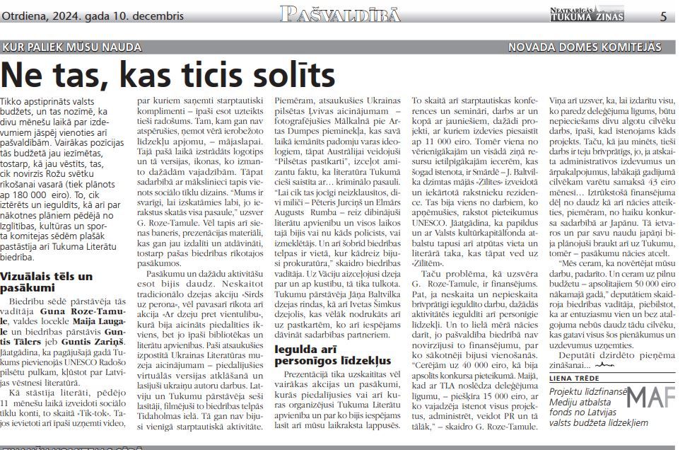 Tikko apstiprināts valsts budžets, un tas nozīmē, ka divu mēnešu laikā par izdevumiem jāspēj vienoties arī pašvaldībām. Vairākas pozīcijas tās budžetā jau iezīmētas, tostarp, kā jau vēstīts, tas, cik novirzīs Rožu svētku rīkošanai vasarā (tiek plānots ap 180 000 eiro). To, cik iztērēts un ieguldīts, kā arī par nākotnes plāniem pēdējā no Izglītības, kultūras un sporta komitejas sēdēm, plašāk pastāstīja arī Tukuma literātu biedrība.