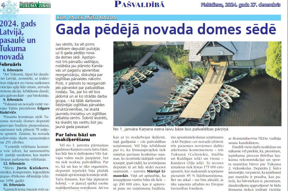 Jau vēstīts, ka vēl pirms svētkiem deputāti pulcējās uz šī gada pēdējo novada domes sēdi. Apstiprinot trīs pārvalžu vadītājus, noslēdza jau plānoto Kandavas un pagastu apvienības reorganizāciju, diskutēja par Izglītības pārvaldes nākotni. Proti, ir plānots to reorganizēt jeb pārveidot par pašvaldības nodaļu. Tas, par ko vēl būs jādomā un ar ko strādās darba grupa, – kā tālāk darbosies līdzšinējās izglītības pārvaldes struktūrvienības, tai skaitā jauniešu Iniciatīvu un izglītības atbalsta centrs. Šobrīd iecerēts, ka skaidrs tas varētu būt jau jaunā gada pavasarī.
