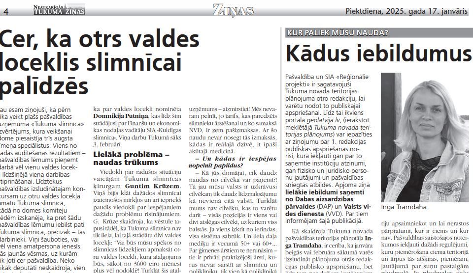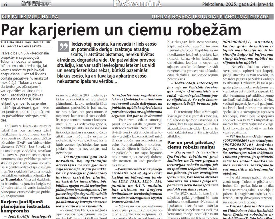 Pašvaldība un SIA «Reģionālie projekti» ir sagatavojuši Tukuma novada teritorijas plānojuma otro redakciju, lai varētu nodot to publiskajai apspriešanai. Līdz tai ikviens portālā geolatvija.lv, ierakstot meklētājā Tukuma novada teritorijas plānojums) var iepazīties ar ziņojumu par 1. redakcijas publiskās apspriešanas norisi, kurā iekļauti gan par to saņemtie institūciju atzinumi, gan fizisko un juridisko personu jautājumi un pašvaldības sniegtās atbildes. Apjoma ziņā lielākie iebildumi saņemti no Dabas aizsardzības pārvaldes (DAP) un Valsts vides dienesta (VVD), un par tiem informējam šajā publikācijā.