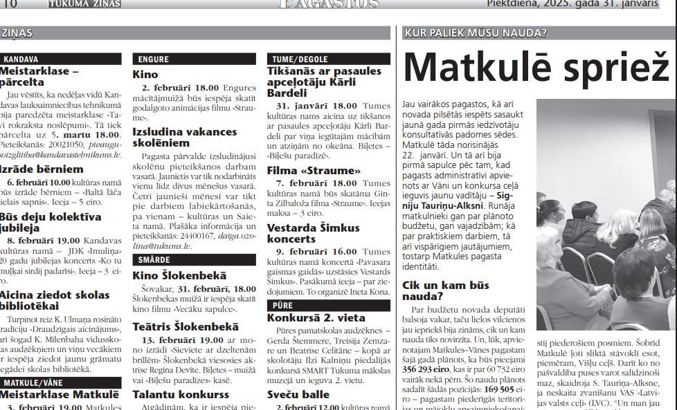 Jau vairākos pagastos, kā arī novada pilsētās iespēts sasaukt jaunā gada pirmās iedzīvotāju konsultatīvās padomes sēdes. Matkulē tāda norisinājās 22. janvārī. Un tā arī bija pirmā sapulce pēc tam, kad pagasts administratīvi apvienots ar Vāni un konkursa ceļā ieguvis jaunu vadītāju – Signiju Tauriņu-Alksni. Runāja matkulnieki gan par plānoto budžetu, gan vajadzībām; kā par praktiskiem darbiem, tā arī vispārīgiem jautājumiem, tostarp Matkules pagasta identitāti.