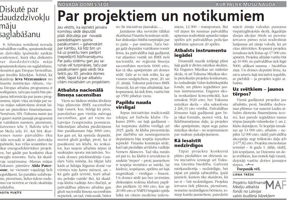 Jau vēstīts, ka iepriekš janvāra komiteju sēdē deputāti plaši diskutēja par novadā paredzētajiem sporta pasākumiem – galvenokārt par kārtību, kā līdz šim un kā uz priekšu tiem piešķirt (nepiešķirt) līdzfinansējumu. Par pašu sistēmu gan jau sarunas vēl turpināsies, taču par pasākumiem gala vārds tika teikts jau 30. janvāra domes sēdē, tāpat kā par atbalstu citām iniciatīvām un projektiem.