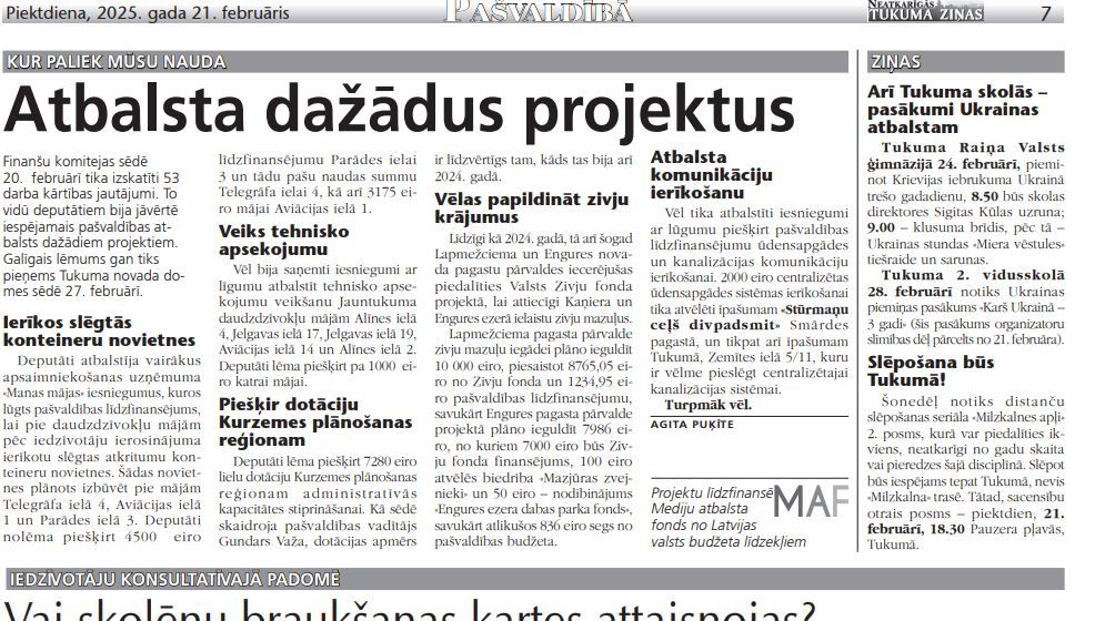 Finanšu komitejas sēdē 20. februārī tika izskatīti 53 darba kārtības jautājumi. To vidū deputātiem bija jāvērtē iespējamais pašvaldības atbalsts dažādiem projektiem. Galīgais lēmums gan tiks pieņems Tukuma novada domes sēdē 27. februārī.