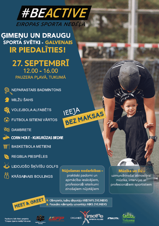 Eiropas Sporta nedēļas ietvaros aicina ikvienu kopā ar ģimeni un draugiem piedalīties #BeActive Eiropas Sporta nedēļas svētku pasākumā, Tukumā, Pauzera pļavā 27. septembrī no 12.00 līdz 16.00