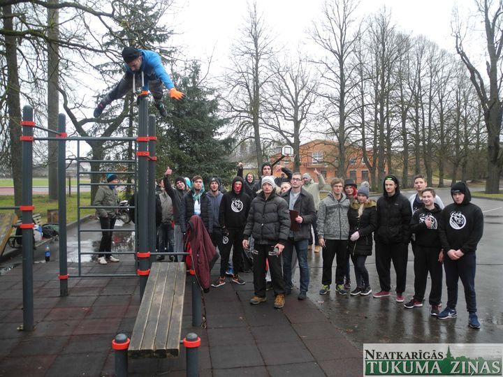 18. decembrī, Lauktehnikā pie ielu vingrošanas stieņiem pulcējās pulciņš pusaudžu – tie, kam patīk vingrot, visvisādi izlokoties uz vingrošanas stieņiem.