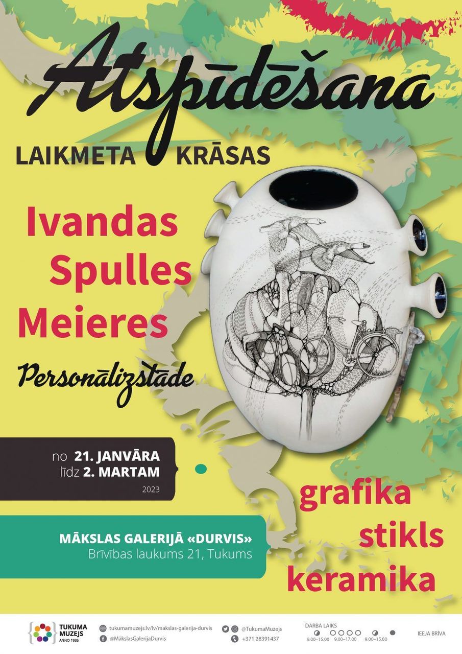 21. janvārī 14.00 Mākslas galerijā “Durvis” (Brīvības laukumā 21, Tukumā) atklās Ivandas Spulles-Meieres personālizstādi “Atspīdēšana. Laikmeta krāsas”. Izstādē būs skatāmas grafikas, kā arī stikla un keramikas darbi.