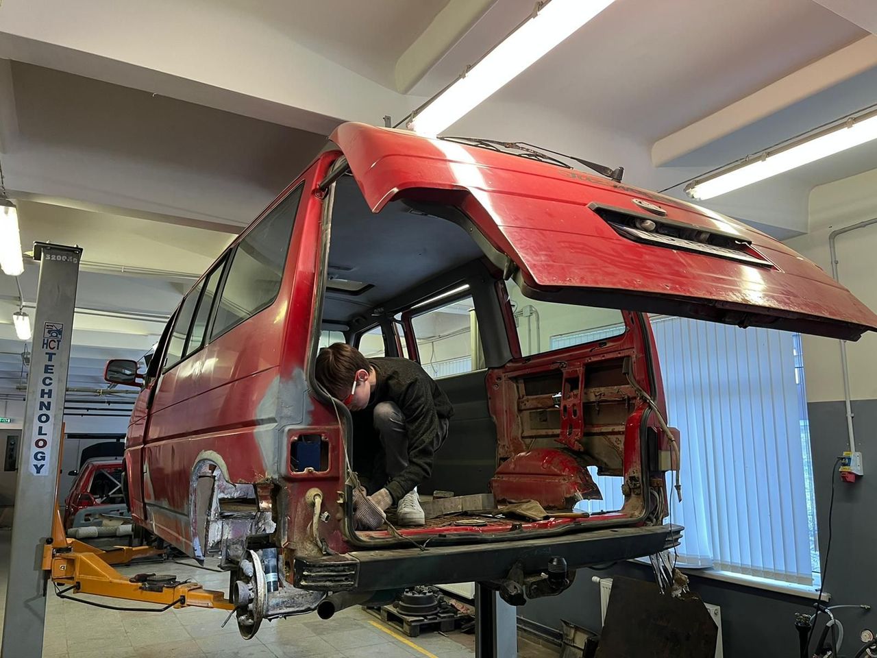 Kandavas Lauksaimniecības tehnikuma automehāniķi remontē mikroautobusu, kas tiks nodots Ukrainas aizstāvjiem/FOTO/
