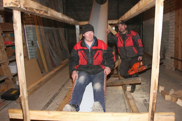 Sijā lietus, veido dubļus, bet uz ceļiem rodas "trepe". Zemītes komunālā dienesta vīri darbnīcās meistaro slīdkalniņu. Pārzāģēja makanu meliorācijas cauruli gareniski pa vidu, un nu bērni vasarā un arī ziemā varēs šļūkt uz leju. Rotaļu laukums ezermalā jau ir. Šūpoles, vēl citādas ietaises, lai atpūstos, spēkus vairotu. Māris Šulcs un Andris Pidze sastiprina brusas. Pašiem gan nāksies kāpt trīsmetru augstumā, sēsties šļūcenē un slidināties lejā. Ezerā vēl nevarēšot ielēkt ar iešļūcienu - tādu uzparikti komunālie iecerējuši nākamgad. Pavalodojam ar vīriem par nesenajiem kriminālajiem notikumiem Zemītē.