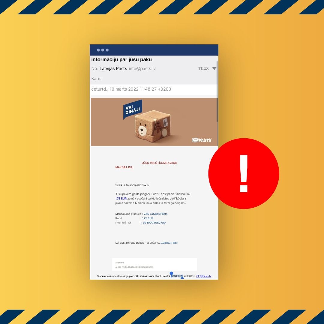 Aicinām mūsu klientus būt īpaši vērīgiem un uzmanīties no aizdomīgiem e-pastiem, kas sūtīti it kā Latvijas Pasta vārdā. E-pastā tiek norādīts, ka it kā saņemts kāds klientam adresēts sūtījumu, un klients tiek aicināts apstiprināt maksājumu, lai varētu saņemt šo sūtījumu. Šādi e-pasti ir krāpšanas mēģinājums!