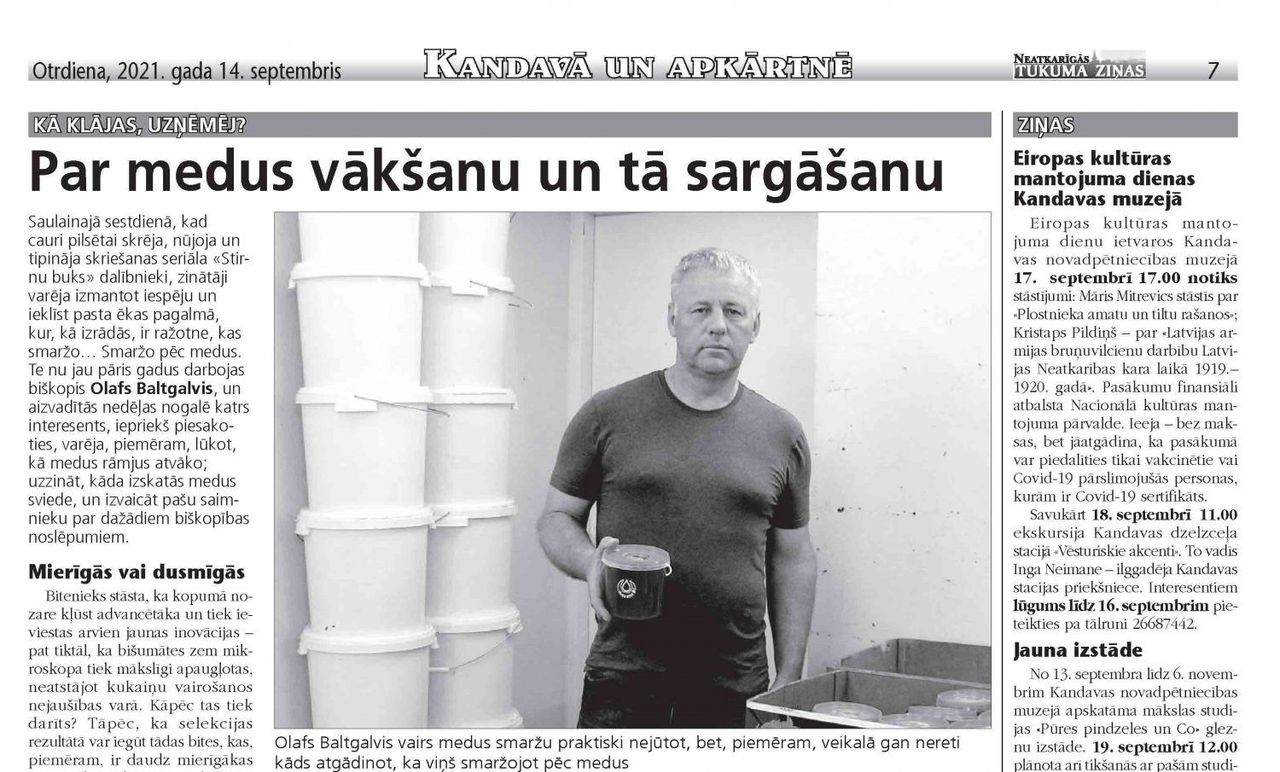 Par medus vākšanu un tā sargāšanu Saulainajā sestdienā, kad cauri pilsētai skrēja, nūjoja un tipināja skriešanas seriāla «Stirnu buks» dalībnieki, zinātāji varēja izmantot iespēju un ieklīst pasta ēkas pagalmā, kur, kā izrādās, ir ražotne, kas smaržo… Smaržo pēc medus. Te nu jau pāris gadus darbojas biškopis Olafs Baltgalvis, un aizvadītās nedēļas nogalē katrs interesents, iepriekš...