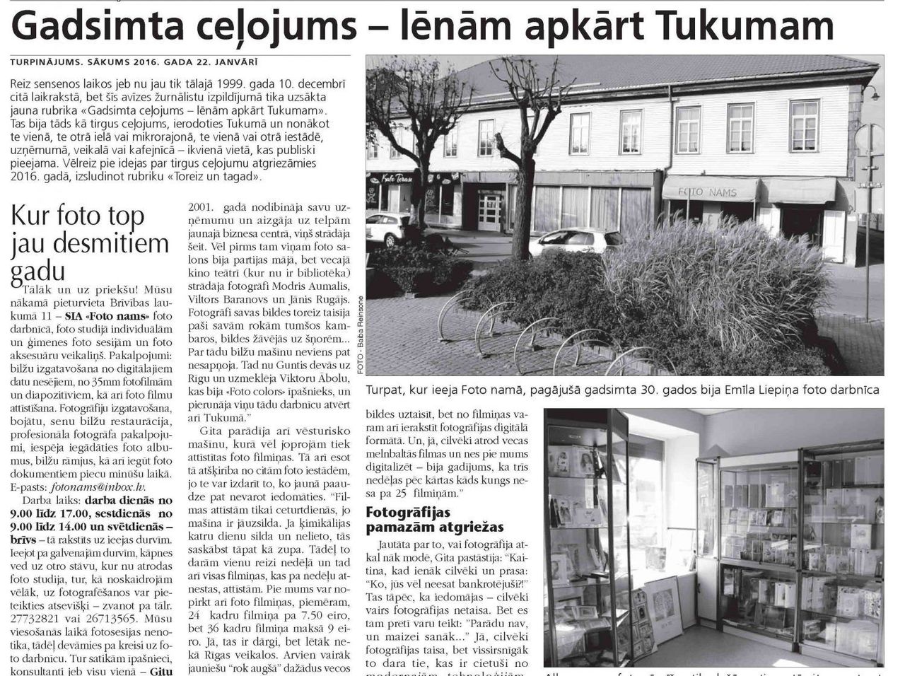 Tālāk un uz priekšu! Mūsu nākamā pieturvieta namā Brīvības laukums 11 – SIA «Foto nams» foto darbnīca, foto studija individuālām un ģimenes foto sesijām un foto aksesuāru veikaliņš. Pakalpojumi: bilžu izgatavošana no digitālajiem datu nesējiem, no 35mm fotofilmām un diapozitīviem, kā arī foto filmu attīstīšana. Fotogrāfiju izgatavošana, bojātu, senu bilžu restaurācija, profesionāla fotogrāfa pakalpojumi, iespēja iegādāties foto albūmus, bilžu rāmjus, kā arī iegūt foto dokumentiem piecu minūšu laikā. E-pasts: fotonams@inbox.lv.