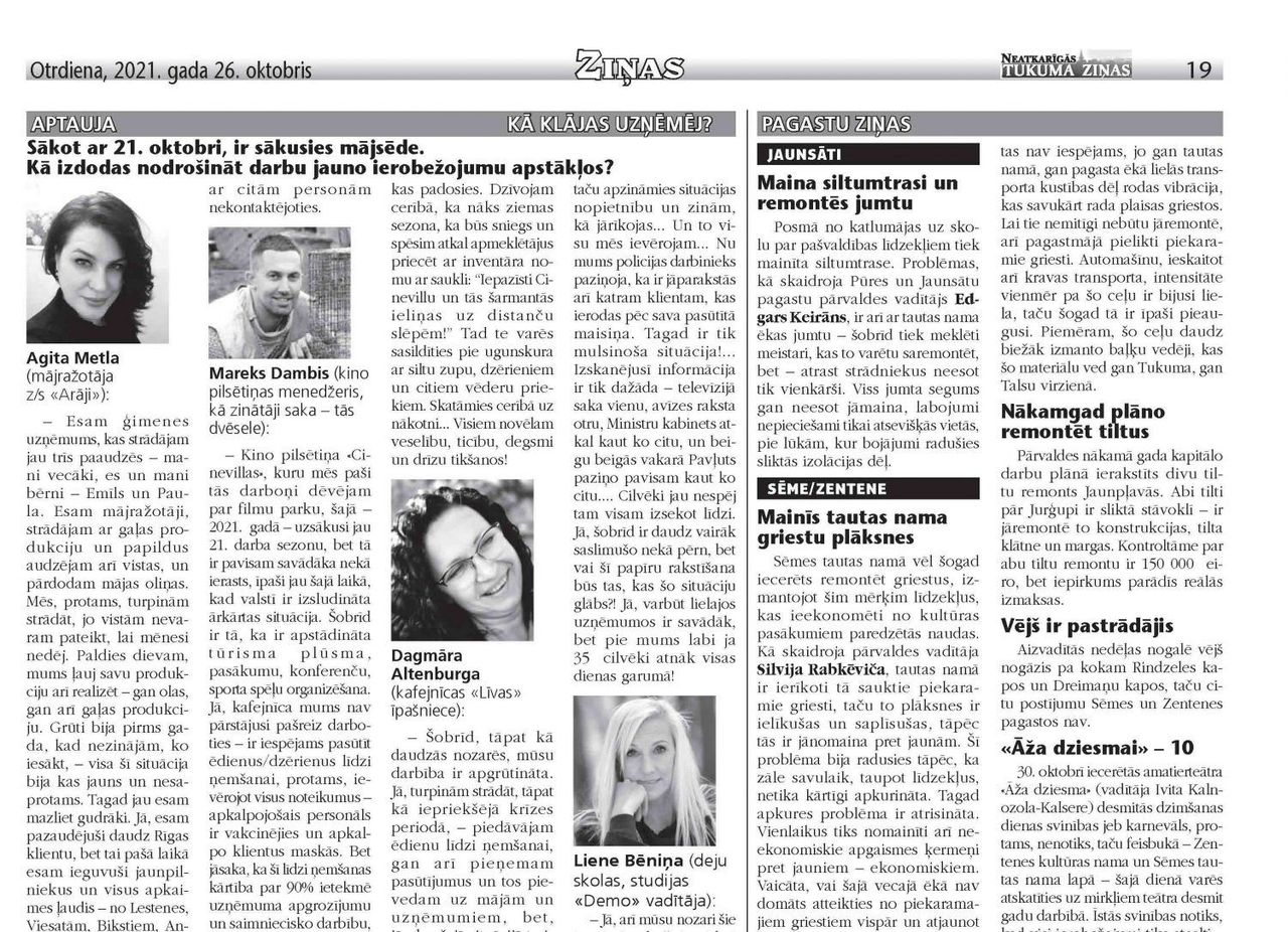 Kādu laiku esam ieturējuši pauzi šai mūsu rubrikai, jo bija arī tā, ka liela daļa uzņēmumu jau nemaz nevarēja strādāt – epidemioloģisko apstākļu dēļ. Bet nu jau mēnesi daudz maz viss ir atgriezies sliedēs. To, ka vecajās, gan nevar teikt, jo, pirmkārt, lielai daļai uzņēmumu jāstrādā zaļajā režīmā, tas ir, gan darbiniekiem, kam apmeklētājiem, klientiem jābūt vai nu vakcinētiem vai kovidizslimojušiem, tāpēc to plūsma ir samazinājusies.