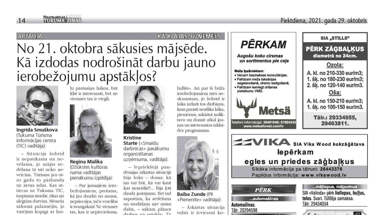 No 21. oktobra sākusies mājsēde. Kā izdodas nodrošināt darbu jauno ierobežojumu apstākļos? Silva Zāgmane (Jaunpils Bebru ielas pirts īpašniece): – Katra krīze nes pārmaiņu iespējamību jeb – Raiņa vārdiem runājot – pastāvēs kas mainīsies. Ierobežojumu laiku izmantosim, lai attīstītu sen lolotas idejas. Esam sešas māsas, katra spējīga radīt skaistas, kvalitatīvas un praktiskas lietas, kā, piemēram,...
