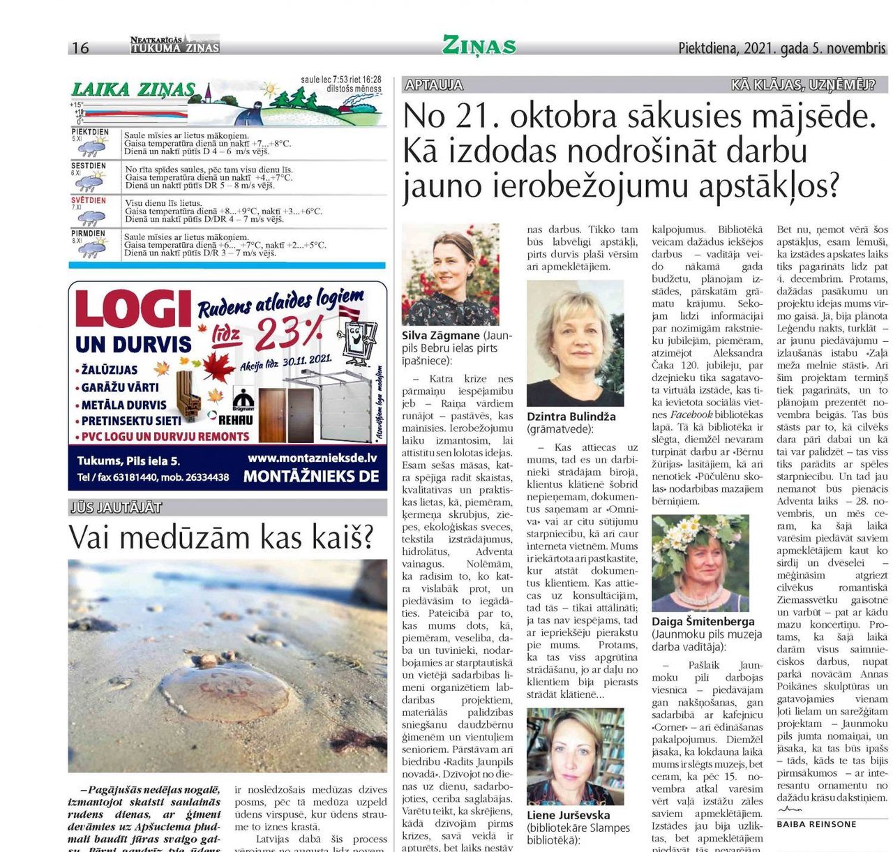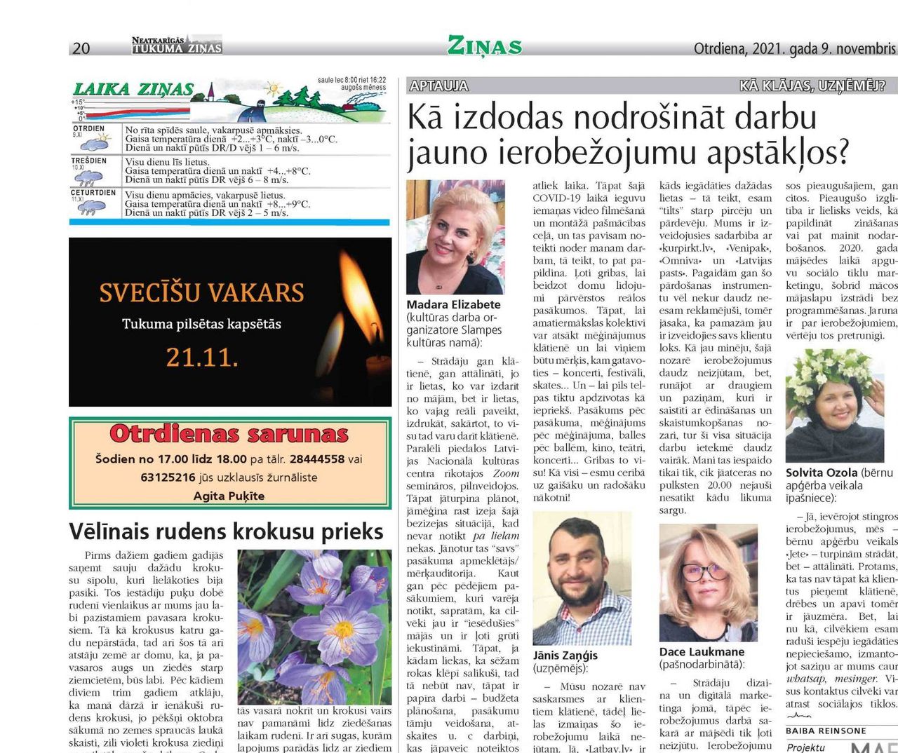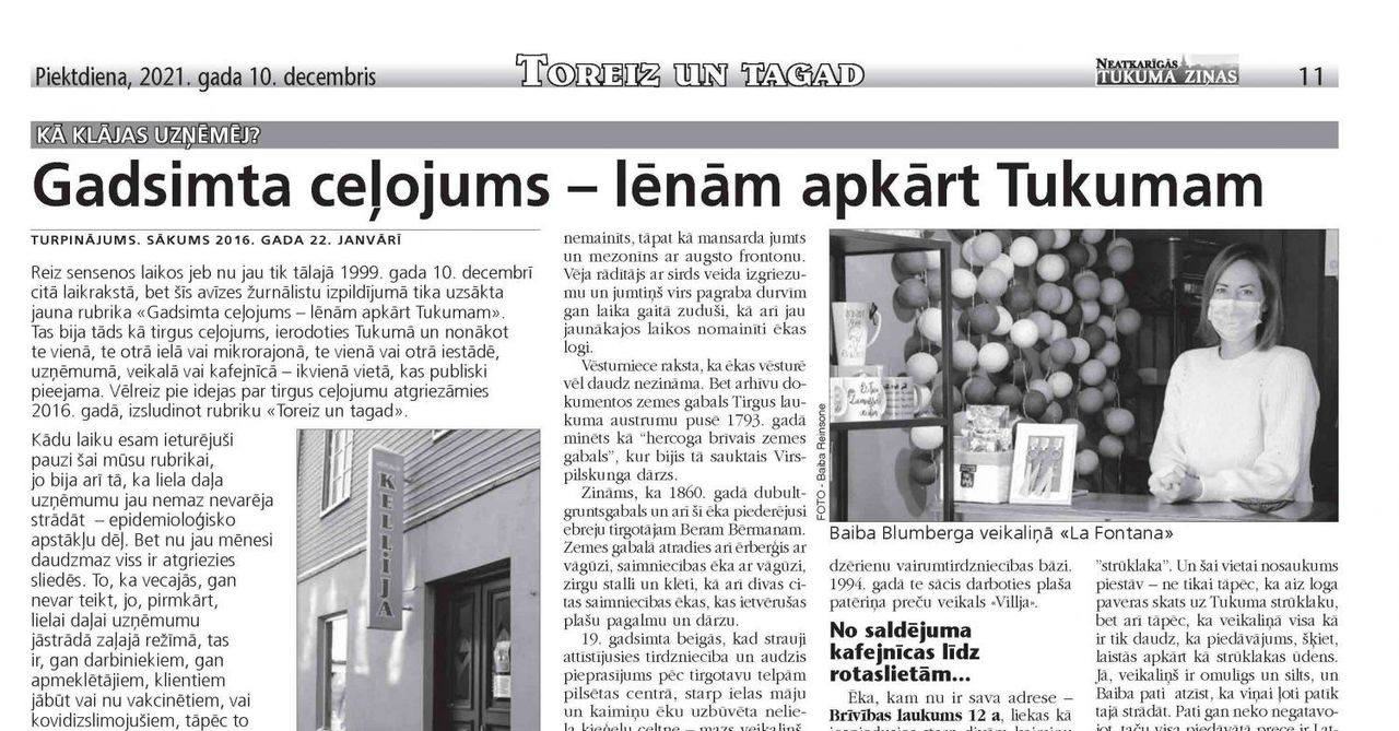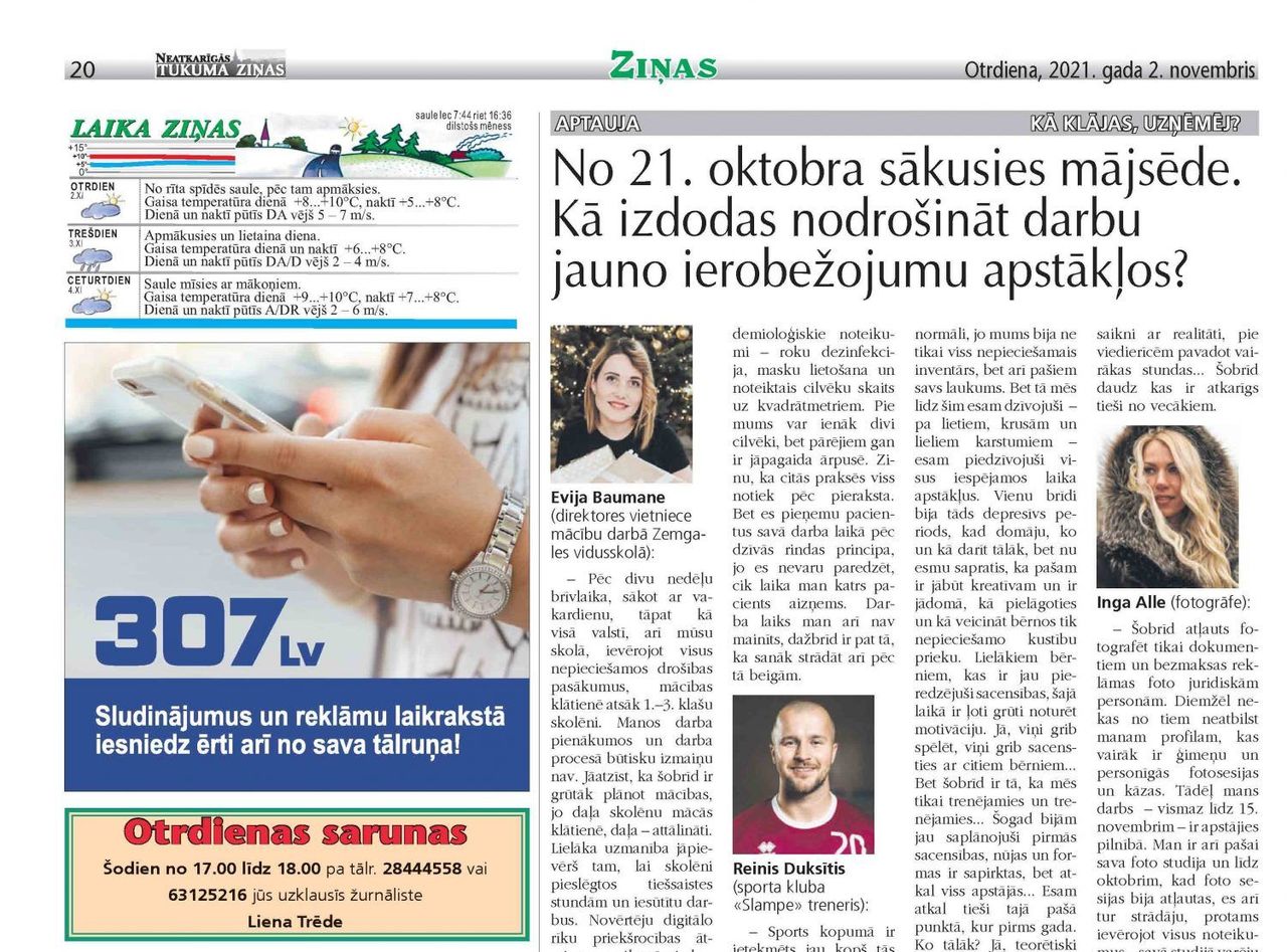 Sākot ar 21. oktobri ir sākusies mājsēde – lokdauns. Kā izdodas nodrošināt darbu jauno ierobežojumu apstākļos? Ingrīda Smuškova (Tukuma Tūrisma informācijas centra vadītāja): – Situācija šobrīd ir nepatīkama un nevēlama, jo mājās sēdēšana tā īsti neko neveicina. Tūrisms jau otro gadu to pārbauda uz savas ādas. Kas attiecas uz Tukuma tūrisma informācijas centru, turpinām strādāt, ...