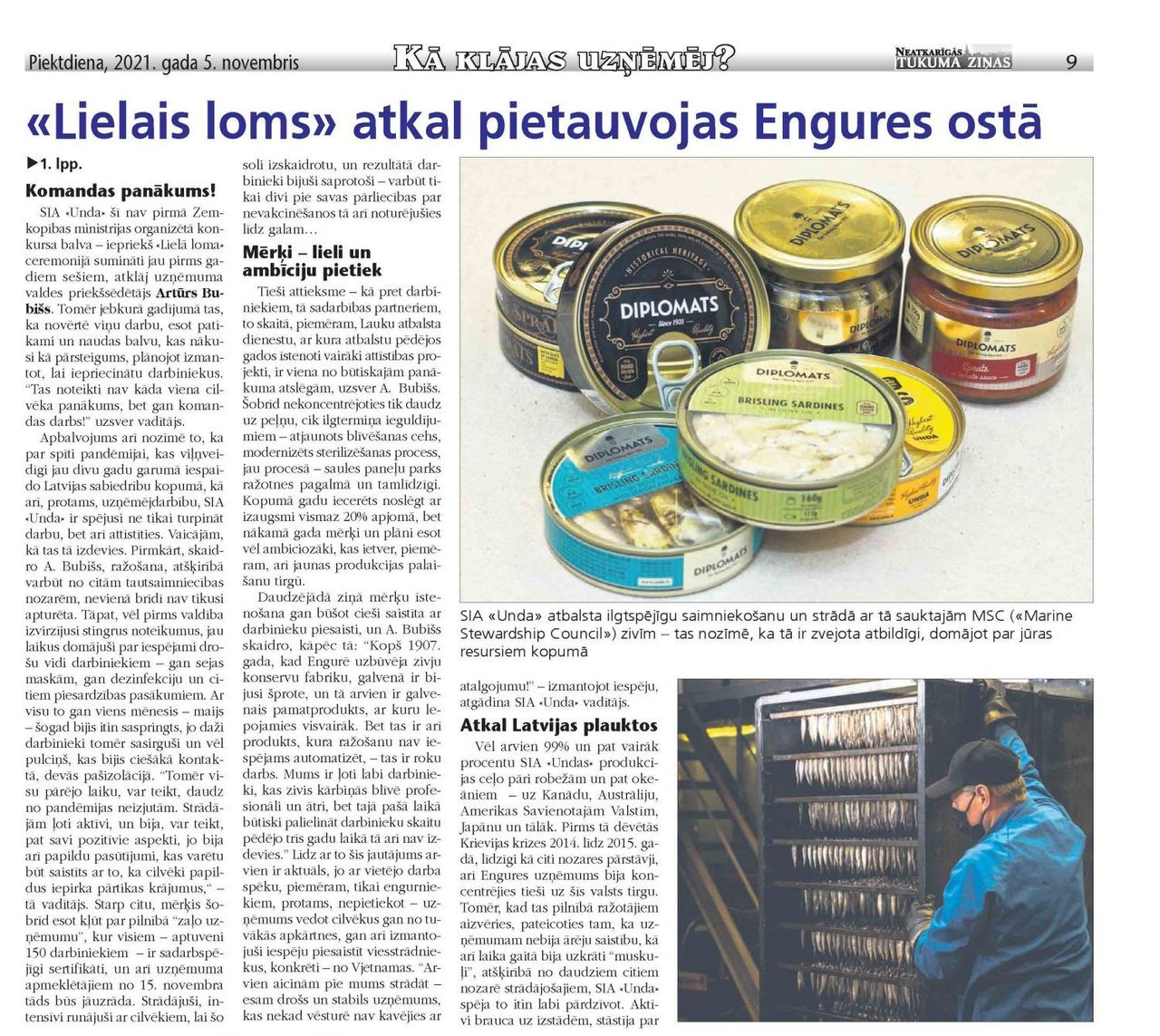 Nedēļas vidū, 3. novembrī, tika izziņoti ikgadējā konkursa «Lielais loms» laureāti. Labāko vidū nominācijā «Gada uzņēmums zivju apstrādē» uzvarētāja laurus plūca mūspuses ražotne – SIA «Unda». Lai arī tradicionālā apbalvošanas ceremonija klātienē šogad atkal izpaliks, tiek solīts, ka stāstus par centīgākajiem zivkopības jomā varēšot lūkot televizoru ekrānos 11. decembrī. Bet jau pirms tam – lai parunātos, piemēram, par pandēmijas nedienām, kā arī attīstības plāniem – uz Enguri devāmies arī mēs – NTZ žurnālisti.