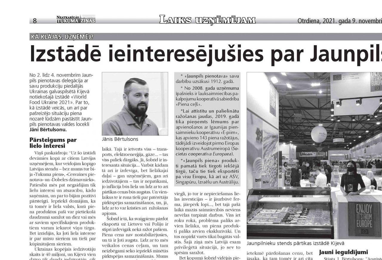 2. līdz 4. novembrim Jaunpils pienotavas delegācija ar savu produkciju piedalījās Ukrainas galvaspilsētā Kijevā notiekošajā izstādē «World Food Ukraine 2021». Par to, kā izstādē veicās un arī par pašreizējo situāciju piena nozarē, jau lūdzam pastāstīt Jaunpils pienotavas valdes locekli Jāni Bērtulsonu.