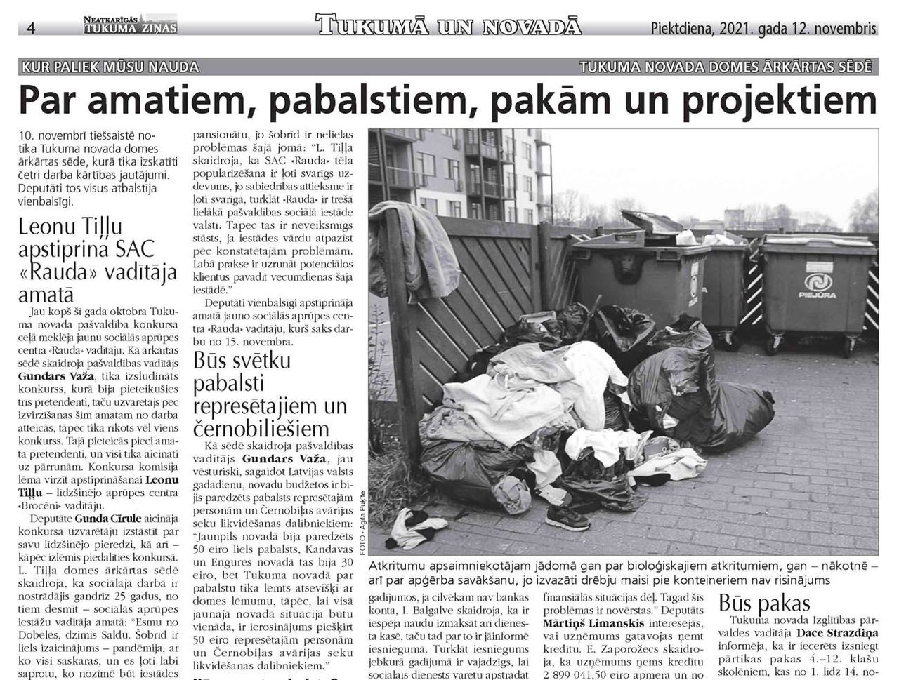 Kur paliek mūsu nauda novembrī tiešsaistē notika Tukuma novada domes ārkārtas sēde, kurā tika izskatīti četri darba kārtības jautājumi. Deputāti tos visus atbalstīja vienbalsīgi. Leonu Tiļļu apstiprina SAC «Rauda» vadītāja amatā Jau kopš šī gada oktobra Tukuma novada pašvaldība konkursa ceļā meklēja jaunu sociālās aprūpes centra «Rauda» vadītāju. Kā ārkārtas sēdē skaidroja pašvaldības vadītājs Gundars...