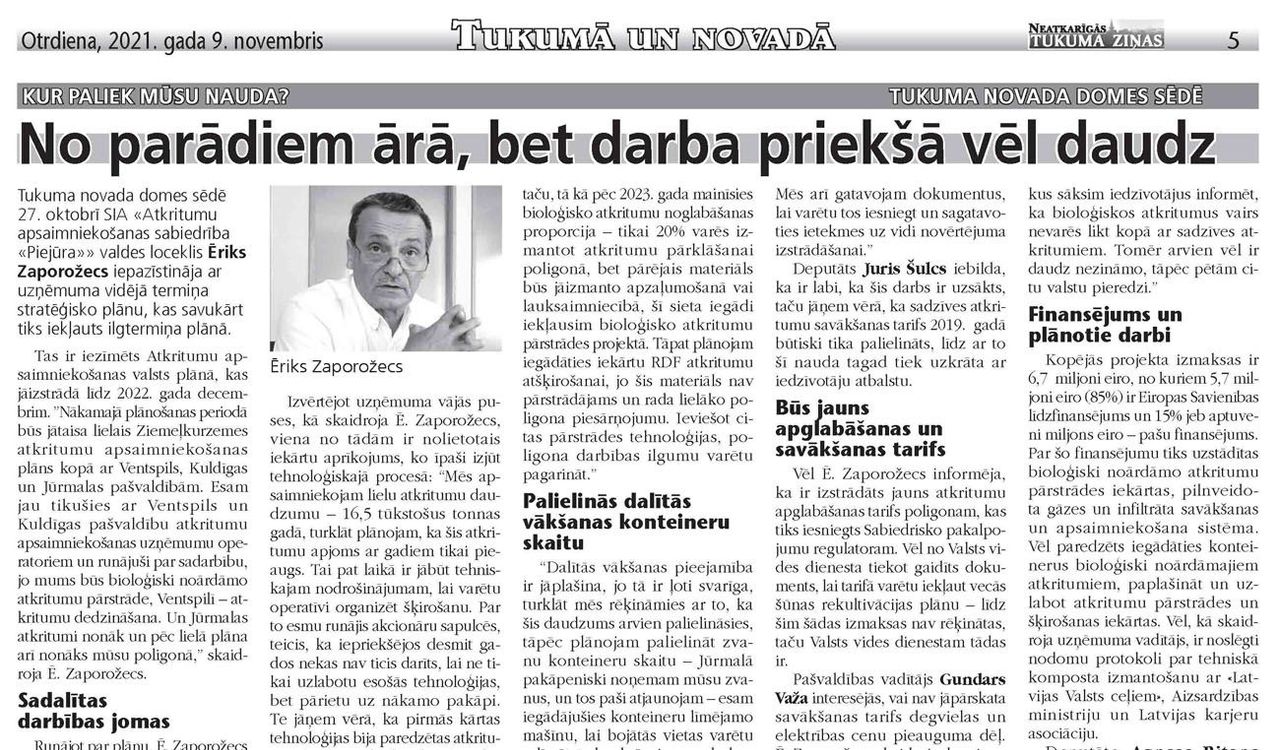 Tukuma novada domes sēdē 27. oktobrī SIA «Atkritumu apsaimniekošanas sabiedrība «Piejūra» valdes loceklis Ēriks Zoporožecs iepazīstināja ar uzņēmuma vidējā termiņa stratēģisko plānu, kas savukārt tiks iekļauts ilgtermiņa plānā. Tas ir iezīmēts Atkritumu apsaimniekošanas valsts plānā, kas jāizstrādā līdz 2022. gada decembrim. ”Nākamajā plānošanas periodā būs jātaisa lielais Ziemeļkurzemes atkritumu apsaimniekošanas plāns kopā ar Ventspils, Kuldīgas un Jūrmalas pašvaldībām. Esam jau tikušies ar Ventspils un Kuldīgas pašvaldību atkritumu apsaimniekošanas uzņēmumu operatoriem un runājuši par sadarbību, jo mums būs bioloģiski noārdāmo atkritumu pārstrāde, Ventspilī – atkritumu dedzināšana. Un Jūrmalas atkritumi nonāk un pēc lielā plāna arī nonāks mūsu poligonā,” skaidroja Ē. Zaporožecs.