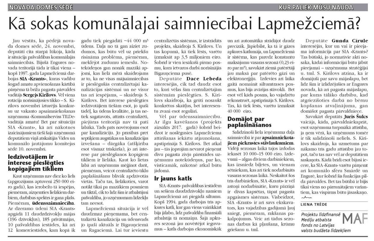 Kur paliek mūsu nauda Jau vēstīts, ka pēdējā novada domes sēdē, 24. novembrī, deputāti cita starpā lūkoja, kāda ir situācija pašvaldības komunālajās saimniecībās. Bijušā Engures novada teritorijā tāda ir tikai viena – kopš 1997. gada Lapmežciemā darbojas SIA «Krants», kuras vadību šogad amatu apvienošanas kārtībā pārņēma tā brīža pagasta pārvaldes vadītājs Sergejs Kirilovs. Vēl viena...