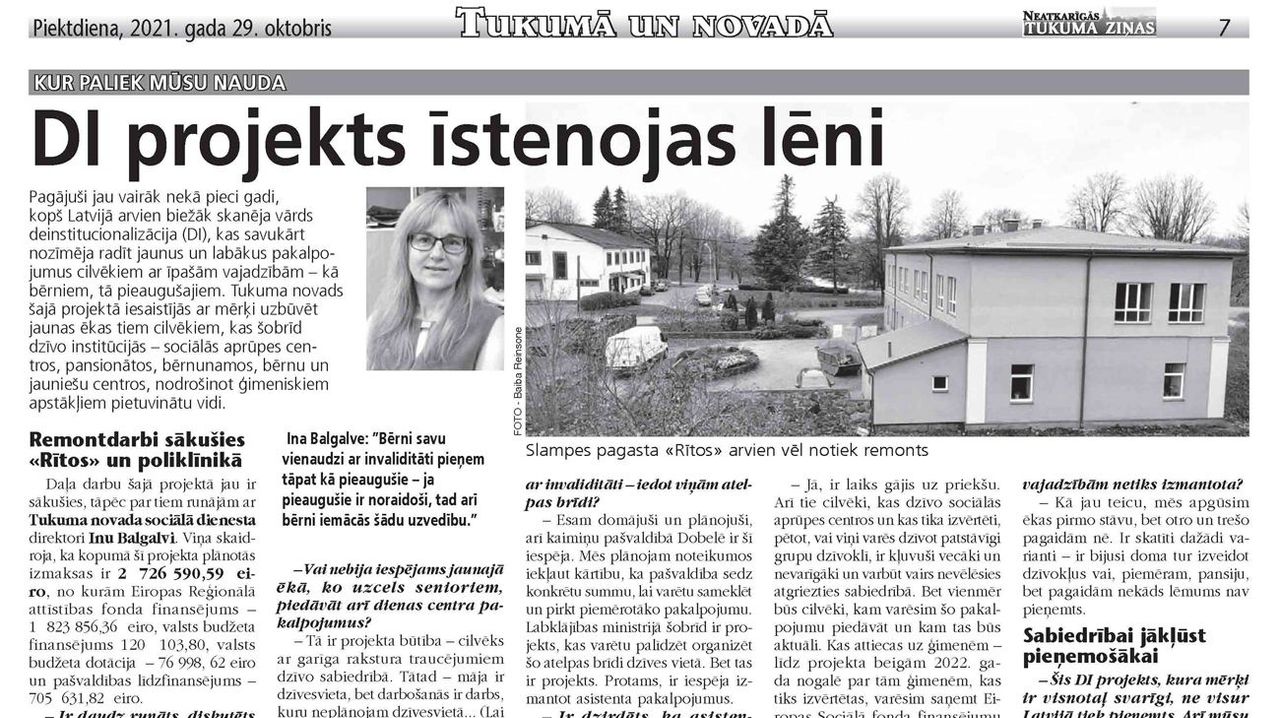 Kur paliek mūsu nauda Pagājuši jau vairāk nekā pieci gadi, kopš Latvijā arvien biežāk skanēja vārds deinstitucionalizācija (DI), kas savukārt nozīmēja radīt jaunus un labākus pakalpojumus cilvēkiem ar īpašām vajadzībām – kā bērniem, tā pieaugušajiem. Tukuma novads šajā projektā iesaistījās ar mērķi uzbūvēt jaunas ēkas tiem cilvēkiem, kas šobrīd dzīvo institūcijās – sociālās aprūpes centros,...