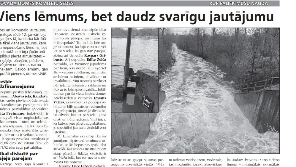 Vides un komunālo jautājumu komitejas sēdē 12. janvārī bija sagadījies tā, ka darba kārtībā bija tikai viens jautājums, kam bija nepieciešams lēmums, bet vēl deputātiem bija jāpārrunā papildus piecas aktualitātes – par gājēju pārejām, plūdiem, latvāņiem un ziemas darbu izmaksām. Galīgo lēmumu gan deputāti pieņems domes sēdē.