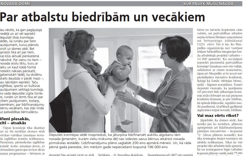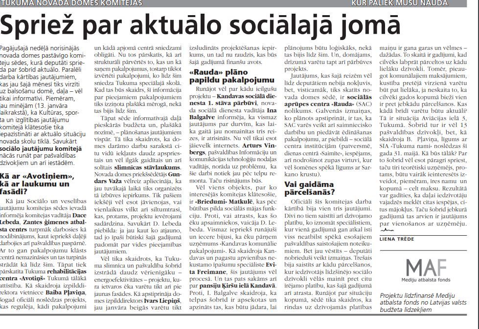 Pagājušajā nedēļā norisinājās novada domes pastāvīgo komiteju sēdes, kurā deputāti sprieda par šobrīd aktuālo. Paralēli darba kārtības jautājumiem, kas jau šajā mēnesī tiks virzīti uz balsošanu domē, daļa – vēl tikai informatīvi. Piemērām, jau minējām (13. janvāra laikrakstā), ka kultūras, sporta un izglītības jautājumu komitejā klātesošie tika iepazīstināti ar aktuālo situāciju novada skolu tīklā. Savukārt sociālo jautājumu komitejā nācās runāt par pašvaldības dzīvokļiem un arī iestādēm.