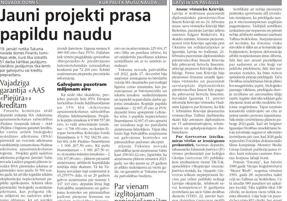 19. janvārī notika Tukuma novada domes Finanšu komitejas sēde, kurā tika izskatīts 51 darba kārtības jautājums. Vairākos jautājumos tika lemts par galvojumu vai kredītu pieprasīšanu.