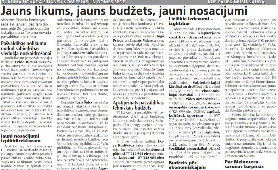 Vispirms Finanšu komitejas sēdē 19. janvārī, pēc tam domes sēdē 26. janvārī deputāti izskatīja jauno Tukuma novada pašvaldības nolikumu.