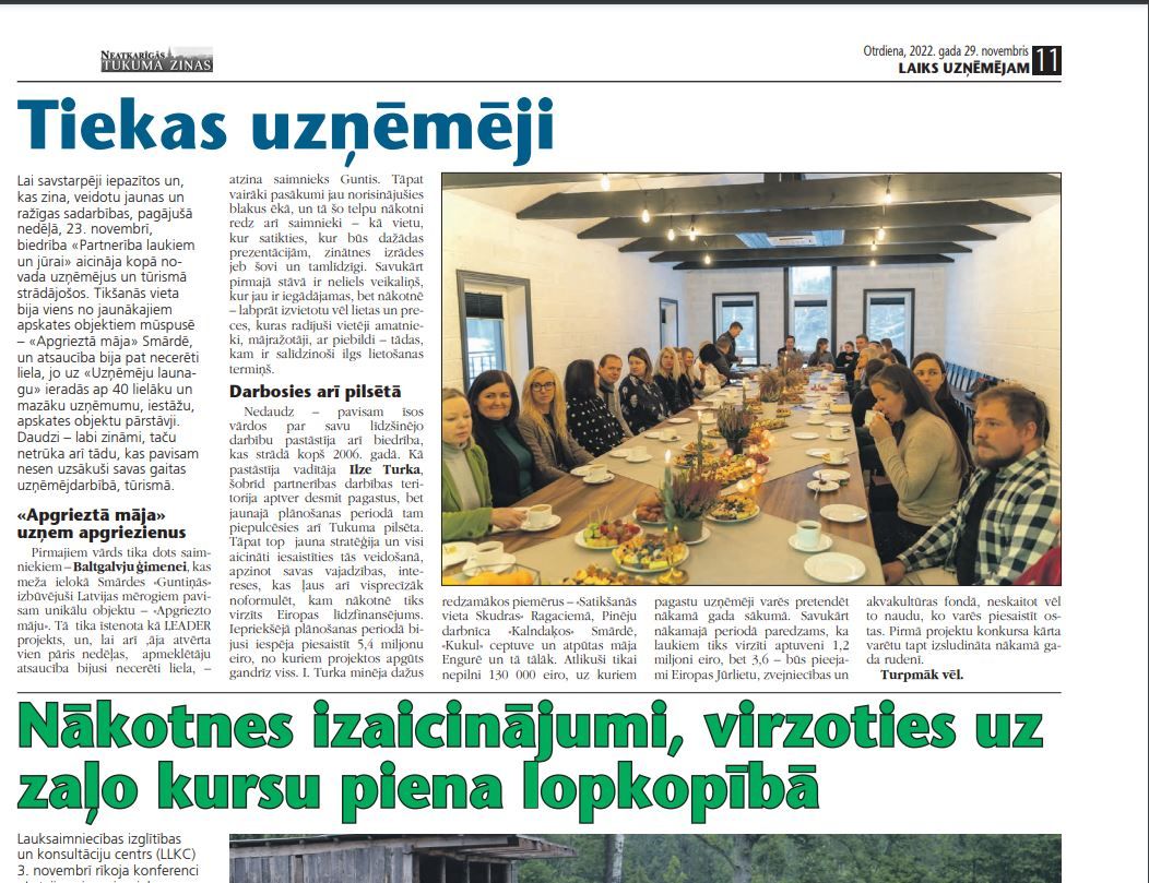 Lai savstarpēji iepazītos un, kas zina, veidotu jaunas un ražīgas sadarbības, pagājušā nedēļā, 23. novembrī, biedrība «Partnerība laukiem un jūrai» aicināja kopā novada uzņēmējus un tūrismā strādājošos. Tikšanās vieta bija viens no jaunākajiem apskates objektiem mūspusē – «Apgrieztā māja» Smārdē, un atsaucība bija pat necerēti liela, jo uz «Uzņēmēju launagu» ieradās ap 40 lielāku un mazāku uzņēmumu, iestāžu, apskates objektu pārstāvji. Daudzi – labi zināmi, taču netrūka arī tādu, kas pavisam nesen uzsākuši savas gaitas uzņēmējdarbībā, tūrismā.